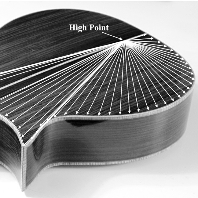 Posted on October 9, 2025October 9, 2025 by Dale Phillips Calculating Guitar Side Height Calculating Guitar Side Height by Mike Doolin Originally published in American Lutherie #75, 2003 and Big Red Book of American Lutherie Volume Seven, 2015 Back in American Lutherie #58 (Big Red Book of American Lutherie Volume Five), Jon Sevy published the article “Calculating Arc Parameters” which described how to calculate the radius, length, or depth of a curve. I’ve used these formulae extensively ever since for radiusing fretboards, making dished workboards, calculating neck angles, and even nonlutherie shop tasks. Recently it occurred to me that one could use them to calculate the height of a guitar’s side at any point. If the guitar has a spherically domed back, the back falls off from its highest point in an arc in every direction, as in the photo. This “high point” is effectively the North Pole of the sphere from which the back arch is taken. If we assume a top whose perimeter is all in the same plane, as in Fig. 1, that plane intersects a line of latitude on that sphere. The high point is therefore the point on the back which is farthest from the plane of the top perimeter. All measurements of side height are then distances between that plane and the surface of the sphere of the back arch. I adapted Jon’s formula to calculate the falloff from the high point on the back to any point on the side: Become A Member to Continue Reading This Article This article is part of the Articles Online featured on our website for Guild members. To view this and other web articles, join the Guild of American Luthiers. For details, visit the membership page. MEMBERS: login for access or contact us to setup your account.
