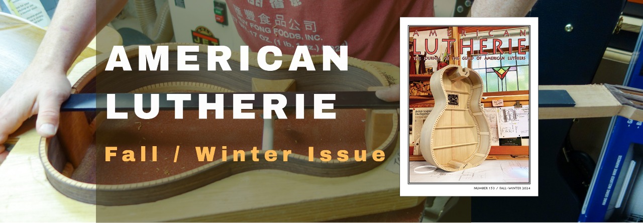 NEWS & UPDATES - HOLIDAY ORDER DEADLINES AND MORE Fall / Winter IssueAMERICAN LUTHERIEBECOME A MEMBERMembershipBenefitARTICLESONLINEDONATEAMERICAN LUTHERIESUMMER ISSUE1939 Martin 0-18 GuitarNEW PLANSpring IssueAMERICAN LUTHERIEFUN STUFF Fall / Winter IssueAMERICAN LUTHERIEBECOME A MEMBERMembershipBenefitARTICLESONLINEDONATEAMERICAN LUTHERIESUMMER ISSUE1939 Martin 0-18 GuitarNEW PLANSpring IssueAMERICAN LUTHERIEFUN STUFF The Guild of American Luthiers is a nonprofit educational membership organization whose purpose is to facilitate learning about lutherie: the art, craft, and science of stringed musical instrument building and repair. Since 1972, we’ve been the foremost source of information for makers, repairers, and restorers of all kinds of string instruments. Guild membership and publications are open to all. Whether you’ve been making instruments for years, or have just acquired the lutherie bug; whether you live in Brooklyn or Bangladesh; whether lutherie is your livelihood or your passion or both; we invite you to join the Guild and learn more about the many ways you can benefit from and contribute to our information sharing system! Membership Benefits Member Discounts Members get discounted prices on our books, back issues, plans, and more. learn more American Lutherie Our respected journal American Lutherie is the main benefit of GAL membership. learn more Articles Online Members can read a growing selection of our articles online. learn more CURRENT ISSUE OF AMERICAN LUTHERIE American Lutherie #156 - Fall/Winter 2025 See Preview The Fall/Winter 2025 issue will be mailed to all 2025 members mid January. New Instrument Plan 1939 Martin 0-18 Guitar GAL Plan #83 Drawn by Tim Olsen GAL History Look back at the Guild’s over 50 years of information sharing. Looking for Something? You can search abstracts of all our articles. Pick a topic, pick an author, or search for a word. It’s fun! go to search page LINKS Are you just getting started in guitar making, or thinking about becoming a luthier? Or are you an experienced builder looking for hard-to-find supplies? See our links to lutherie schools, suppliers, organizations, events and more! browse links