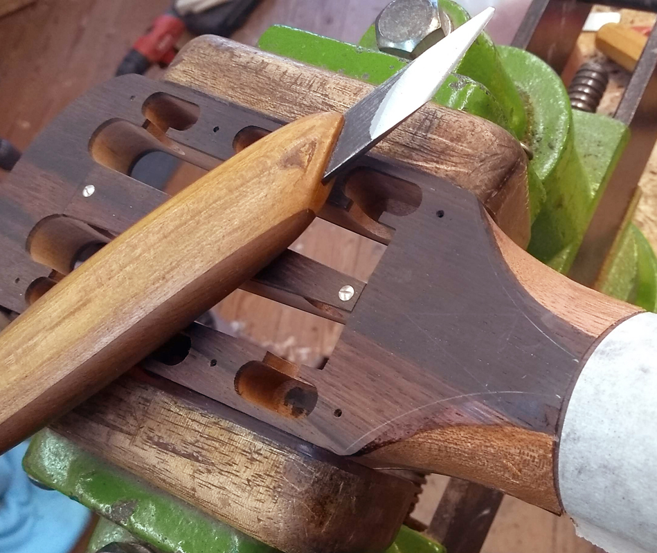 Simon Burgun won French national recognition for his reproduction of a René Lacôte Romantic guitar. (Yes, my American friends; they really are that civilized over there on The Continent.) In this article Simon shows how he made the rosewood-veneered neck with a grafted peghead and heel. See AL#154 for his article on reproducing the spectacular MOP-and-ebony rosette using period-appropriate machinist’s techniques.